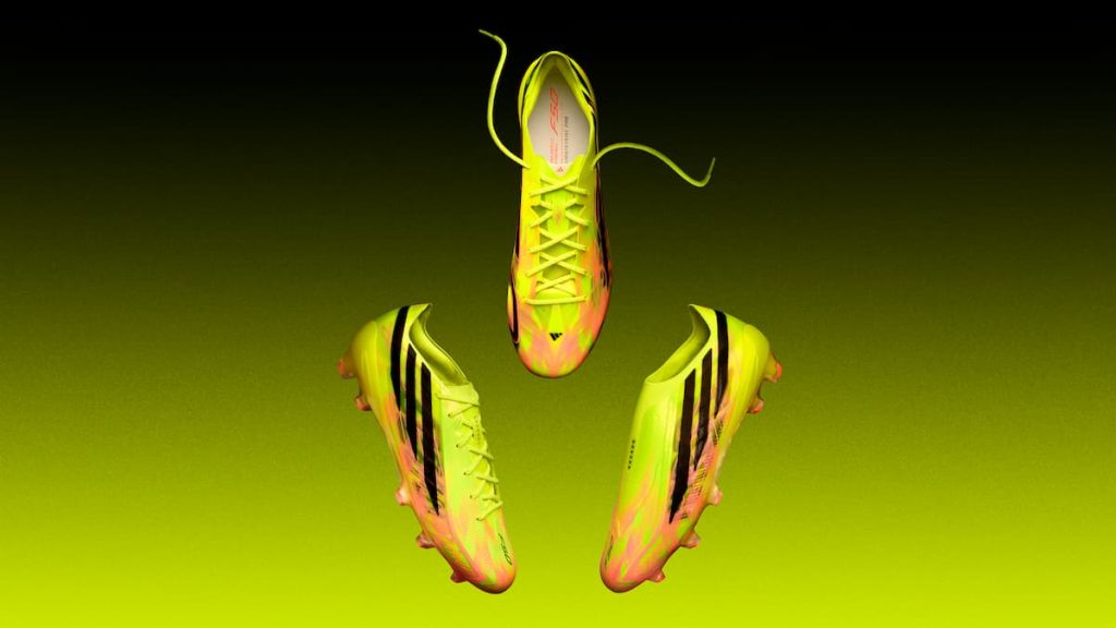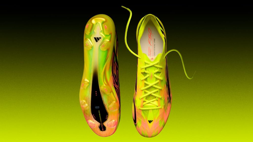 La imagen de la F50 HYPERFAST EVO acompaña esa idea de aceleración. adidas apuesta por una combinación cromática vibrante de amarillo y naranja, con el logotipo F50 recorriendo el lateral exterior. Las tres rayas diagonales características de la línea atraviesan la silueta desde el talón y envuelven la bota, mientras la suela amarilla, brillante y reluciente, refuerza su presencia visual. El resultado es una pieza de impacto, diseñada para ser reconocible sobre el césped y para trasladar al plano estético la misma intensidad que promete desde el plano técnico.