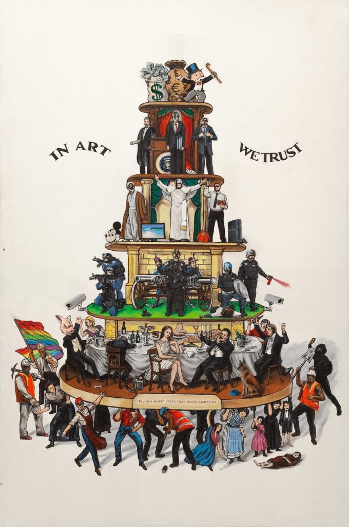 Ozmo (Gionata Gesi). Tú vales más que muchos gorriones (En el arte confiamos), 2016. Acrílico sobre PVC reciclado. Artrust.Ch © Cortesía del artista.