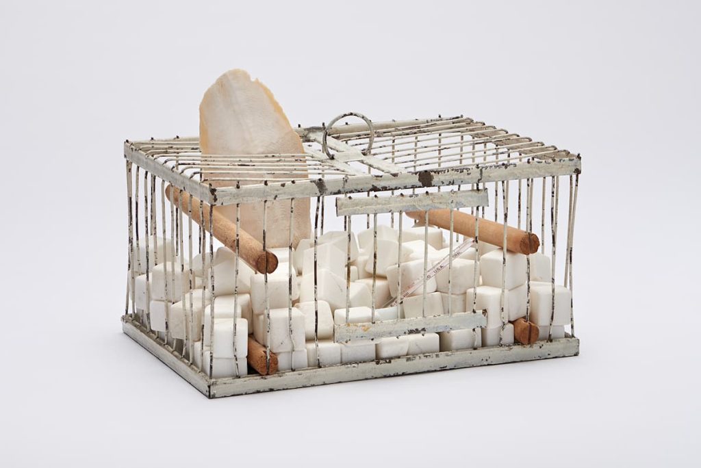 Marcel Duchamp. ¿Por qué no estornudar, Rose Sélavy?, 1921. Jaula de metal pintada, madera, cubos de mármol, un par de platos de cristal blanco, termómetro, hueso de sepia, Museo de Arte de Filadelfia: Colección Louise y Walter Arensberg.