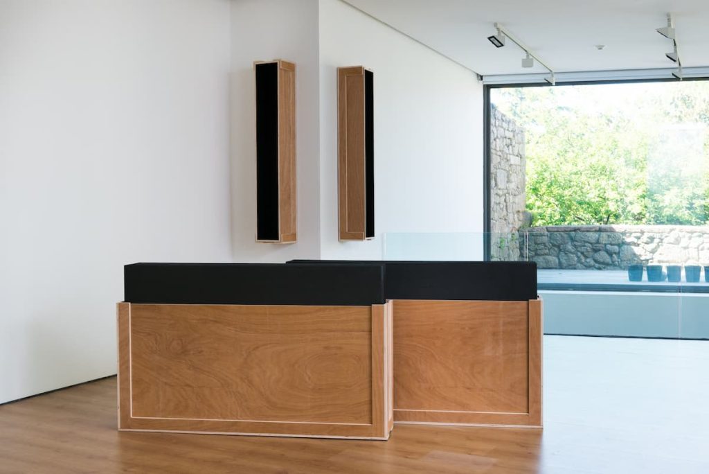 El pasillo de distribución se transforma en un espacio de experimentación sensorial. Allí, la artista confronta la tradicional jerarquía entre sentidos “nobles” e “innobles” mediante una selección de obras de Lo necesario y lo posible y Muestrario (2019-2020). Lijas y espumas de insonorización conviven en un juego de contrastes entre lo áspero y lo blando, lo duro y lo silencioso. Esta activación de los sentidos refuerza una de las convicciones centrales de Álvarez-Laviada: la obra no se completa hasta que es experimentada por quien la recorre.
