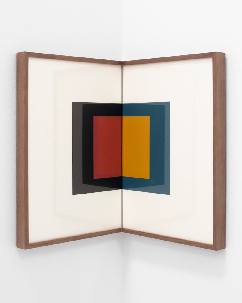 El itinerario expositivo se abre con una serie de obras dominadas por la combinación del amarillo, el rojo y el azul sobre negro, resultado de la mezcla de los tres colores primarios. Álvarez-Laviada se inscribe aquí en una larga tradición de investigación cromática que va del suprematismo al neoplasticismo, pasando por los estudios de Joseph Albers, cuya Casa Blanca B (1947-1954) acompaña esta sección. En el centro de la sala, la pieza Y yo a vueltas (2025) altera la circulación habitual del visitante, proponiendo una forma distinta de habitar el espacio y apelando a una experiencia corporal e individual.