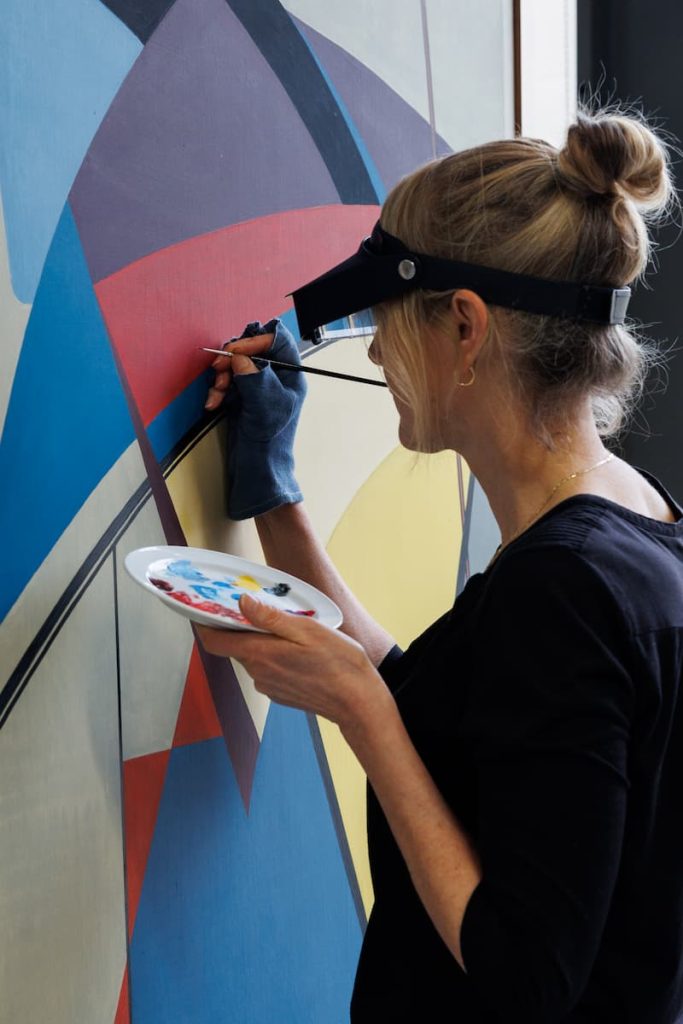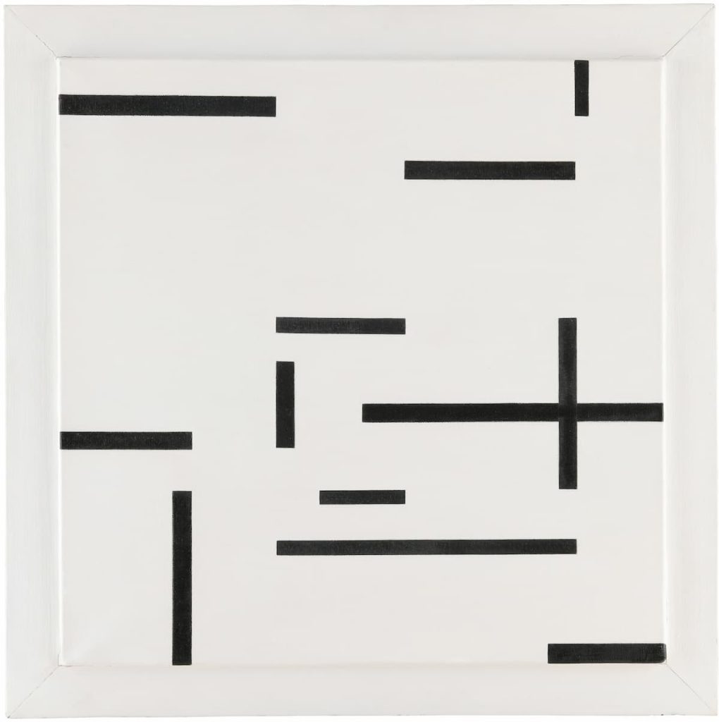 La elección de un nombre masculino no es un detalle anecdótico, sino un síntoma de época. Fascinada por la abstracción geométrica, Warburg desarrolló un lenguaje visual propio basado en la interacción entre colores primarios y líneas rectas y curvas. Fraction de la réalité —una de sus pinturas de mayor formato— presenta dos grandes campos triangulares, uno azul oscuro y otro amarillo oscuro, separados por líneas nítidas. Una forma azul claro, de contornos redondeados, irrumpe en la composición y rompe deliberadamente la rigidez geométrica.