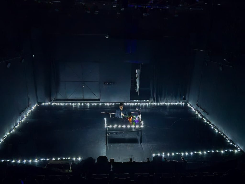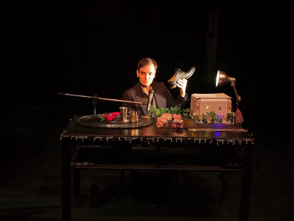 Estrenada en Buenos Aires en 2024, la obra está codirigida por el propio Delgado y por la actriz y directora Sofía Brito, ambos autores de la dramaturgia. La puesta en escena reduce el artificio al mínimo indispensable: una silla, un micrófono de pie, una mesa con objetos. Nada distrae de lo esencial. Al inicio, el intérprete permanece sentado, casi inmóvil, como si habitara una sala de interrogatorios. A medida que avanza la grabación, el cuerpo empieza a responder: reproduce la detención, el encierro, la violencia, la espera. No ilustra el relato; lo traduce en acción física, lo vuelve presente sin estetizar el horror.