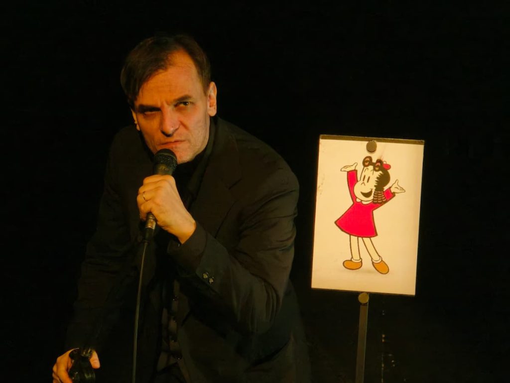 Ese testimonio grabado —no recreado, no interpretado— es el corazón de Seré. Delgado no “dice” el texto: lo encarna. Como un muñeco consciente, se deja habitar por una voz ajena que emerge desde los altavoces y toma posesión de su gesto, de su respiración, de su desplazamiento en escena. La ventriloquia aquí no es un truco, sino un dispositivo político: alguien presta el cuerpo para que otro, al que intentaron borrar, vuelva a hablar.