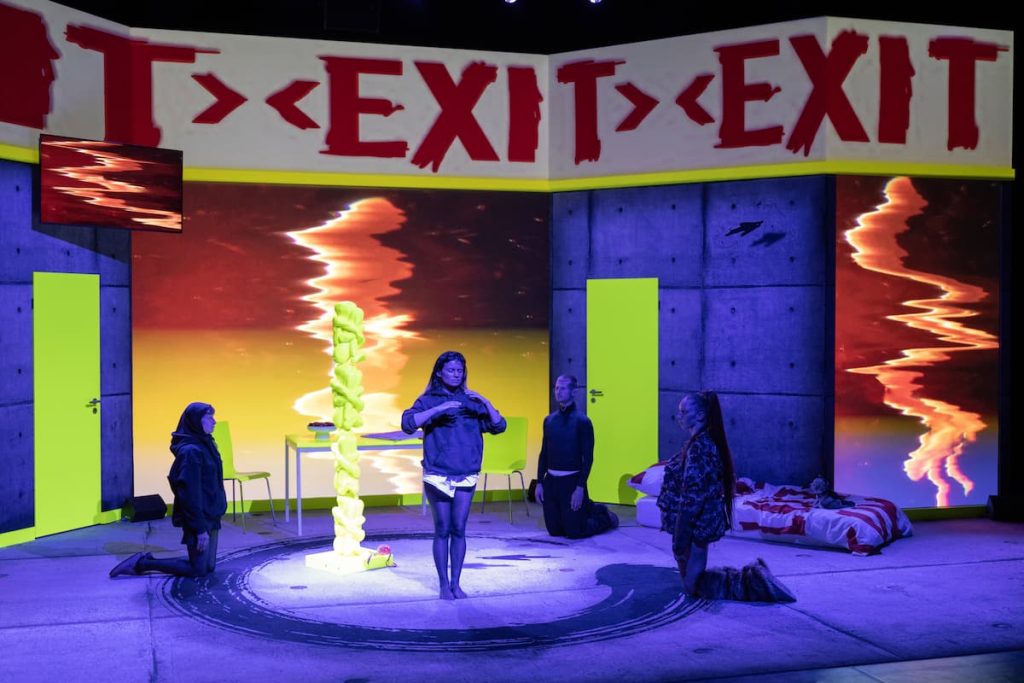 A la sensación de irrealidad que desprende Angela (a strange loop) contribuye un escenario hiperrealista, con una estética de ciencia ficción que transmite la sensación de falsedad con sus colores antinaturalistas (grises, verde lima fluorescente), con la presencia de la tecnología (pantallas que emiten vídeos), con los diálogos que los personajes han grabado previamente y que en escena reproducen como en un playback ligeramente desincronizado, o en situaciones surrealistas, como que la protagonista desaparece del escenario y al cabo reaparece embarazada y da a luz por la boca a un bebé.