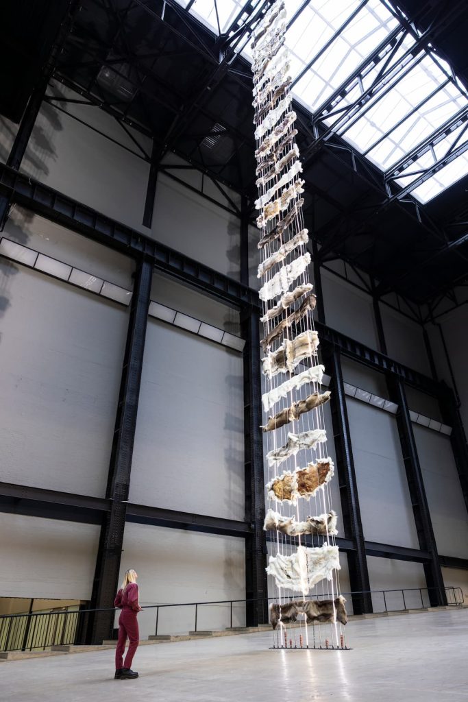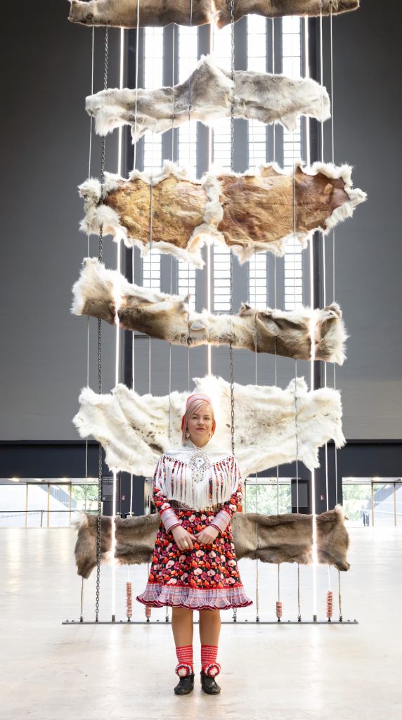Hyundai Commission: Máret Ánne Sara: Goavve-Geabbil installation view featuring -Geabbil at Tate Modern 2025. © Máret Ánne Sara. Photo © Tate (Sonal Bakrania)