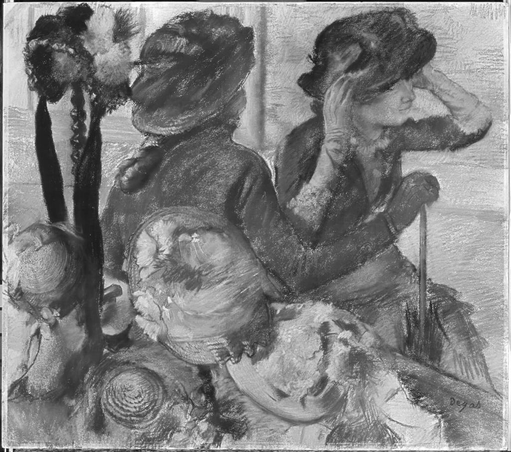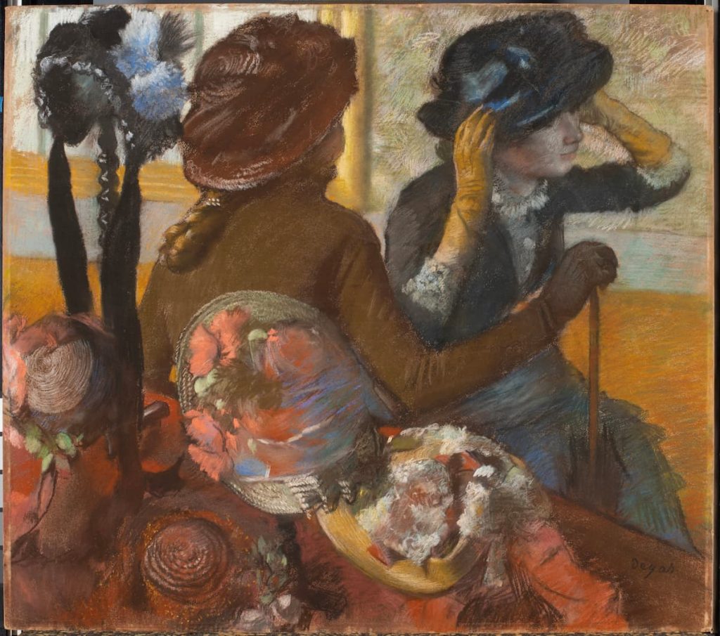Aunque Degas es universalmente asociado a sus bailarinas —tema del que llegó a producir alrededor de mil quinientas obras—, también dirigió su mirada hacia escenas cotidianas y, en concreto, a las sombrererías. Este motivo lo abordó en veintisiete creaciones, la mayoría pasteles, aunque también óleos y dibujos, casi todos realizados a partir de la década de 1890. El ejemplar que alberga el Thyssen, objeto de esta investigación, figura entre los más tempranos y constituye una pieza clave para comprender su evolución técnica.