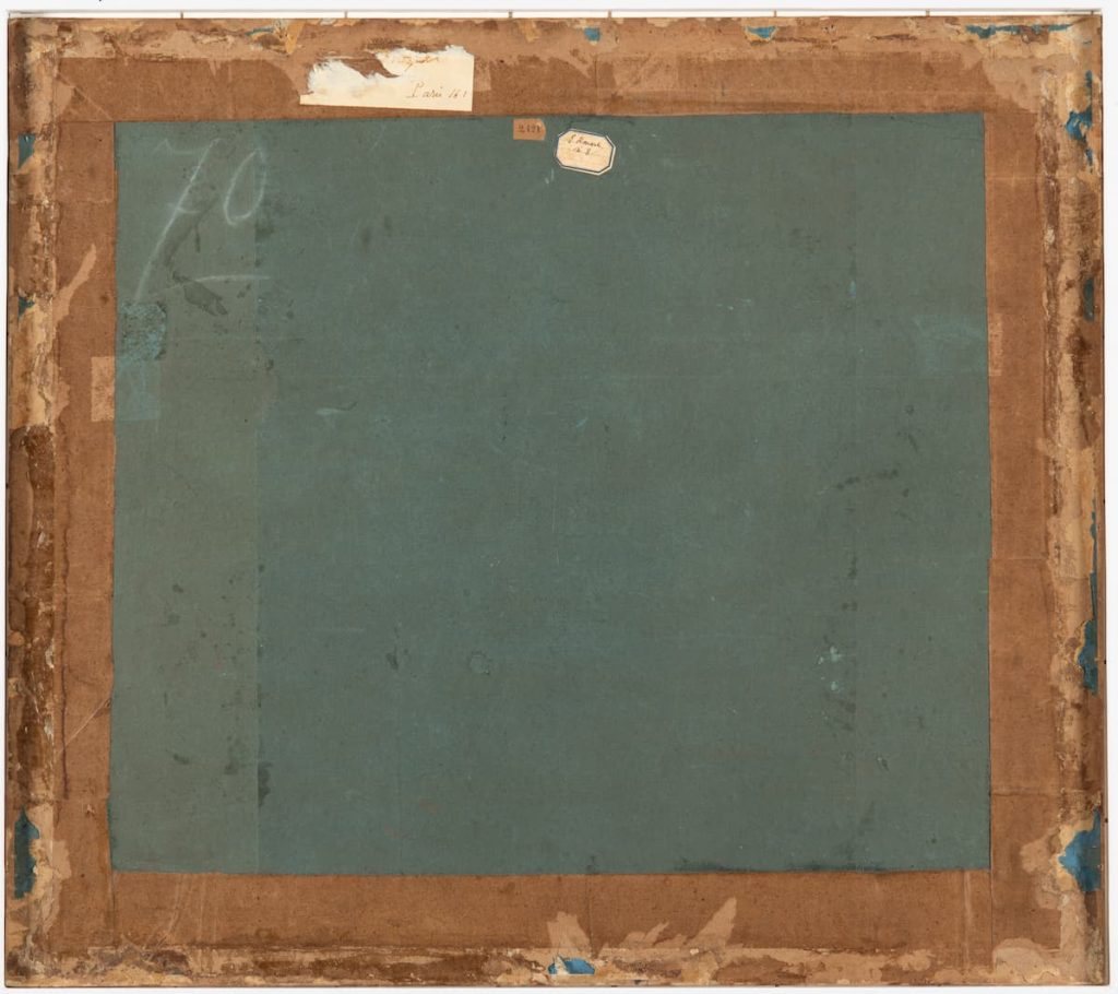 El estudio del soporte físico detalla que el pastel está realizado sobre un papel plegado sobre un cartón rígido, sujeto al reverso mediante tiras de papel engomado. Por el anverso, el papel no está adherido: simplemente reposa sobre el cartón. Aun así, el estado general es estable, sin alteraciones relevantes, y la capa pictórica se mantiene íntegra.