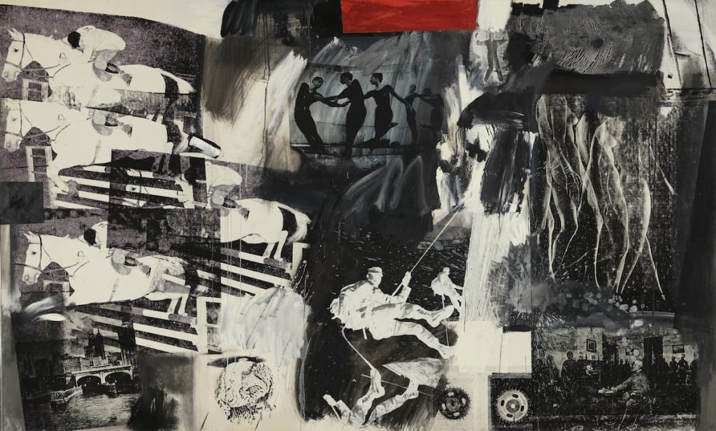 A mediados de la década de 1950, Rauschenberg inició la serie de los combine paintings (1954–1964), obras híbridas en las que convergen pintura, escultura, collage y objetos encontrados, en su mayoría procedentes del imaginario cotidiano de la sociedad de consumo. En 1962, y en diálogo con las investigaciones visuales de Andy Warhol, comenzó a experimentar con la serigrafía comercial, una técnica que marcaría decisivamente su producción posterior. Este procedimiento le permitió ampliar, repetir y superponer imágenes fotográficas —extraídas de su archivo personal o de publicaciones periódicas— y construir así un universo visual fragmentado, dinámico y profundamente ligado a su tiempo.